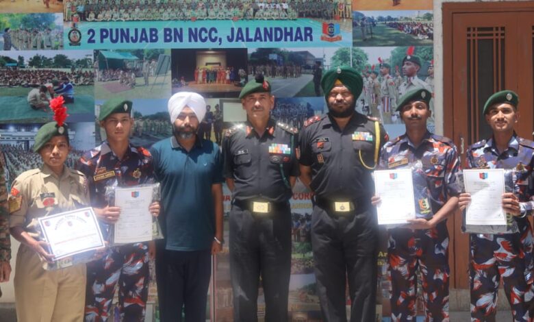 जालंधर, एच एस चावला। 2 पंजाब एनसीसी बटालियन में अलग-अलग वर्गों में बेहतरीन प्रदर्शन करने वाले कैडेट्स का सम्मान किया गया। बटालियन कमांडर कर्नल विनोद जोशी ने प्रेस रिलीज में कहा कि अंडर अफसर लवप्रीत सिंह और सार्जेंट गुड़िया वर्मा लायलपुर खालसा कॉलेज; कैडेट शगुन डी ए वी इंजीनियरिंग एंड टेक्नोलॉजी कॉलेज, कैडेट अभिषेक कौशल स्टेट पब्लिक स्कूल को बटालियन ने ट्रैकसूट और सर्टिफिकेट देकर सम्मानित किया है। गुड़िया वर्मा को सामाजिक कार्य के लिए और बाकी कैडेट्स को थल सेना कैंप, नई दिल्ली में किए गए बेहतरीन प्रदर्शन के लिए यह सर्टिफिकेट दिए गए हैं। उनके साथ लायलपुर खालसा कॉलेज के एसोसिएट एनसीसी ऑफिसर लेफ्टिनेंट करणवीर सिंह और लेफ्टिनेंट हरभजन सिंह भी मौजूद थे। कर्नल जोशी ने कैडेट्स की हौसला अफजाई करते हुए कहा कि एनसीसी विद्यार्थियों को भारतीय सेवा में कमीशन प्राप्त करने के लिए बहुत ही मददगार साबित होती है। इसलिए अपनी व्यक्तित्व को सुधारने के लिए कैडेट्स को अपनी पढ़ाई के साथ-साथ सांस्कृतिक कार्यक्रमों और खेलों में भी बढ़-चढ़कर भाग लेना चाहिए ताकि वह सेना में ऑफिसर बनने के अपने सपने को साकार कर सके।