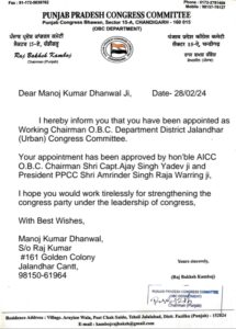 जालंधर कैंट, एच एस चावला। पंजाब प्रदेश कांग्रेस कमेटी द्वारा अपने ओबीसी डिपार्टमेंट का विस्तार करते हुए चेयरमैन पंजाब राज बख्श कंबोज ने जालंधर कैंट निवासी मनोज धनवाल को जिला जालंधर (शहरी) का चेयरमैन नियुक्त किया है। चंडीगढ़ स्थित कांग्रेस भवन में ओबीसी डिपार्मेंट,पंजाब के उप चेयरमैन बलकार सिंह जोशन ने मनोज को नियुक्ति पत्र देकर उनकी ओपचारिक रूप से घोषणा की । इस दौरान उनके साथ सुरेश कुमार,कमल कुमार तथा सोनू कुमार भी उपस्थित रहे।