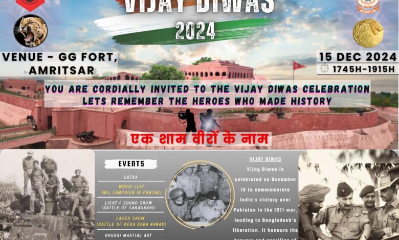 पंजाब राज्य युद्ध नायक स्मारक और संग्रहालय, अमृतसर में 13-14 दिसंबर 2024 को सुबह 1000 बजे से शाम 1700 बजे तक “हथियार और उपकरण प्रदर्शन” आयोजित किया जाएगा और एक सांस्कृतिक समारोह “एक शाम वीरों के नाम” 15 दिसंबर 2024 को शाम 1730 बजे से 1930 बजे तक गोबिंदगढ़ किले, अमृतसर में आयोजित किया जाएगा, जिसमें गतका, खुखरी नृत्स, लाइट एंड साउंड शो (सारागढ़ी की लड़ाई), लेजर शो और मूवी क्लिप (पंजाब में सैन्य अभियान) शामिल होंगे, जिसमें सारागढ़ी की सबसे भीषण लड़ाई सहित भारतीय सेना के योद्धाओं की समृद्ध विरासत को दिखाया जाएगा। युद्ध के दौरान सर्वोच्च बलिदान देने वाले बहादुर सैनिकों को श्रद्धांजलि के रूप में एक फ्यूजन बैंड कॉन्सर्ट आयोजित किया जाएगा। यह आयोजन “सभी के लिए खुला” है और भारतीय सशस्त्र बलों को करीब से देखने और उनसे बातचीत करने का एक आदर्श अवसर है।