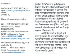 ਪੈਰਿਸ, (PRIME INDIAN NEWS) :- ਪਿਛਲੇ ਦਿਨੀਂ ਪੰਜਾਬ ਕਾਂਗਰਸ ਦੇ ਪ੍ਰਧਾਨ ਸ਼੍ਰੀ ਰਾਜਾ ਵੜਿੰਗ ਵਲੋਂ ਮਰਹੂਮ ਮੰਤਰੀ ਬੂਟਾ ਸਿੰਘ ਬਾਰੇ, ਵਰਤੀ ਗਈ ਭੱਦੀ ਅਤੇ ਇਤਰਾਜਯੋਗ ਸ਼ਬਦਾਵਲੀ ‘ਤੇ ਸਖ਼ਤ ਇਤਰਾਜ ਜਤਾਉਂਦੇ ਹੋਏ ਮਨੁੱਖੀ ਅਧਿਕਾਰ ਸੰਸਥਾ (ਔਰਰ -ਡਾਨ) ਰਜਿਸਟਰਡ (ਫਰਾਂਸ ) ਦੇ ਪ੍ਰਧਾਨ ਸ. ਇਕਬਾਲ ਸਿੰਘ ਭੱਟੀ ਅਤੇ ਵਾਲਮੀਕ ਸਭਾ ਫਰਾਂਸ ਰਜਿਸਟਰਡ ਦੇ (ਪ੍ਰਧਾਨ ) ਗੁਰਮੇਲ ਸਿੰਘ ਮੱਟੂ ਅਤੇ ਪੰਜਾਬ ਕਾਂਗਰਸ ਦੇ ਪ੍ਰਧਾਨ ਰਾਜਾ ਵੜਿੰਗ ਖਿਲਾਫ ਬਣਦੀ ਕਾਨੂੰਨੀ ਕਾਰਵਾਈ ਕਰਵਾਉਣ ਲਈ, ਇੰਚਾਰਜ ਐਨ ਆਰ ਆਈਜ ਥਾਣਾ ਜਲੰਧਰ ਨੂੰ email ਰਾਹੀਂ ਸ਼ਿਕਾਇਤ ਕੀਤੀ ਹੈ।