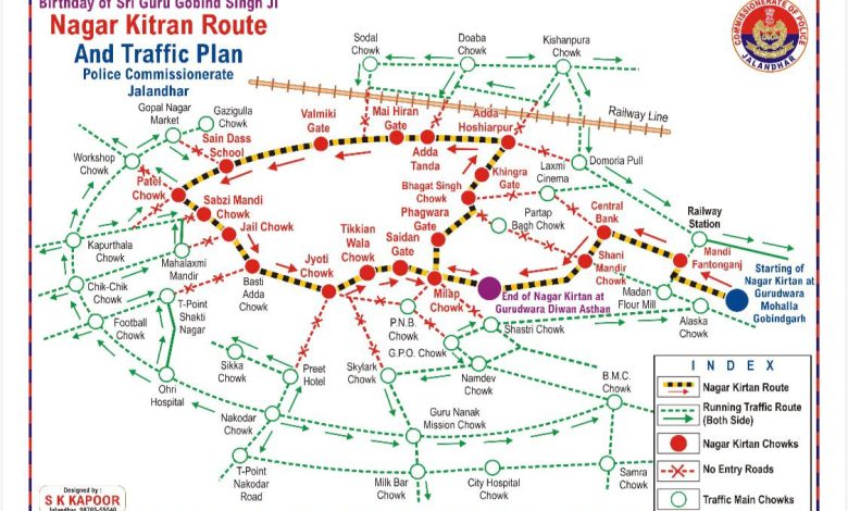 ਜਲੰਧਰ, ਐਚ ਐਸ ਚਾਵਲਾ। ਸ੍ਰੀ ਗੁਰੂ ਗੋਬਿੰਦ ਸਿੰਘ ਸਿੰਘ ਦੇ ਪ੍ਰਕਾਸ਼ ਪੁਰਬ ਦੇ ਸਬੰਧ ਵਿੱਚ ਮਿਤੀ 02/01/2026 ਦਿਨ ਸ਼ੁੱਕਰਵਾਰ ਨੂੰ ਵਿਸ਼ਾਲ ਨਗਰ ਕੀਰਤਨ ਜਲੰਧਰ ਸ਼ਹਿਰ ਵਿੱਚ ਕੱਢਿਆ ਜਾ ਰਿਹਾ ਹੈ। ਇਹ ਨਗਰ ਕੀਰਤਨ ਗੁਰਦੁਆਰਾ ਸ੍ਰੀ ਗੁਰੂ ਸਿੰਘ ਸਭਾ ਮੁਹੱਲਾ ਗੋਬਿੰਦਗੜ੍ਹ ਜਲੰਧਰ ਤੋਂ ਆਰੰਭ ਹੋ ਕਿ ਐਸ.ਡੀ ਕਾਲਜ-ਭਾਰਤ ਸੋਡਾ ਫੈਕਟਰੀ-ਰੇਲਵੇ ਰੋਡ-ਮੰਡੀ ਫੈਟਨਗੰਜ-ਗੁਰਦੁਆਰਾ ਦੀਵਾਨ ਅਸਥਾਨ ਸੈਂਟਰਲ ਟਾਊਨ-ਮਿਲਾਪ ਚੌਂਕ-ਫਗਵਾੜਾ ਗੇਟ-ਸ਼ਹੀਦ ਭਗਤ ਸਿੰਘ ਚੌਂਕ-ਪੰਜ ਪੀਰ ਚੌਂਕ-ਖਿੰਗਰਾ ਗੇਟ-ਗੁਰਦੁਆਰਾ ਸ੍ਰੀ ਸਿੰਘ ਸਭਾ ਅੱਡਾ ਹੁਸ਼ਿਆਰਪੁਰ-ਮਾਈ ਹੀਰਾ ਗੇਟ-ਭਗਵਾਨ ਵਾਲਮੀਕ ਗੇਟ-ਪਟੇਲ ਚੋਂਕ-ਸਬਜੀ ਮੰਡੀ ਚੋਂਕ-ਜੇਲ੍ਹ ਚੋਂਕ-ਬਸਤੀ ਅੱਡਾ ਚੋਂਕ-ਭਗਵਾਨ ਵਾਲਮੀਕ ਚੋਂਕ (ਜੋਤੀ ਚੋਂਕ)-ਰੈਣਕ ਬਜਾਰ-ਮਿਲਾਪ ਚੋਂਕ ਵੱਲ ਦੀ ਹੁੰਦਿਆਂ ਹੋਇਆ ਗੁਰਦੁਆਰਾ ਸ਼੍ਰੀ ਦੀਵਾਨ ਅਸਥਾਨ ਸੈਂਟਰਲ ਟਾਊਨ ਵਿੱਖੇ ਪੁੱਜ ਕੇ ਸਮਾਪਤੀ ਕਰੇਗਾ। ਇਸ ਨਗਰ ਕੀਰਤਨ ਵਿੱਚ ਸੰਗਤਾਂ ਦੀ ਭਾਰੀ ਆਮਦ ਨੂੰ ਮੱਦੇ ਨਜਰ ਰੱਖਦੇ ਹੋਏ ਨਗਰ ਕੀਰਤਨ ਦੇ ਉਕਤ ਰੂਟ ਪਰ ਕਮਿਸ਼ਨਰੇਟ ਪੁਲਿਸ ਜਲੰਧਰ ਵਲੋਂ ਮਿਤੀ 02/01/2026 ਨੂੰ ਸਮਾਂ 09.00 AM ਤੋਂ 10.00 PM ਤੱਕ ਹੇਠ ਲਿਖੇ ਅਨੁਸਾਰ ਪੁਆਂਇੰਟਾਂ/ਚੋਂਕਾਂ ਤੋਂ ਆਵਾਜਾਈ ਨੂੰ ਡਾਇਵਰਟ ਕੀਤਾ ਗਿਆ ਹੈ : 👇