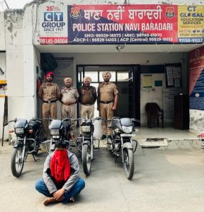 ਜਲੰਧਰ, ਐਚ ਐਸ ਚਾਵਲਾ। ਪੁਲਿਸ ਕਮਿਸ਼ਨਰ ਸ੍ਰੀ ਸਵਪਨ ਸ਼ਰਮਾ ਦੀ ਅਗਵਾਈ ਹੇਠ ਜਲੰਧਰ ਕਮਿਸ਼ਨਰੇਟ ਪੁਲਿਸ ਨੇ ਇੱਕ ਵੱਡੀ ਸਫਲਤਾ ਹਾਸਲ ਕਰਦੇ ਹੋਏ ਇੱਕ ਵਿਅਕਤੀ ਨੂੰ ਗ੍ਰਿਫਤਾਰ ਕਰਕੇ ਉਸਦੇ ਕੋਲੋਂ 4 ਚੋਰੀ ਦੇ ਮੋਟਰਸਾਈਕਲ ਬਰਾਮਦ ਕੀਤੇ ਹਨ।