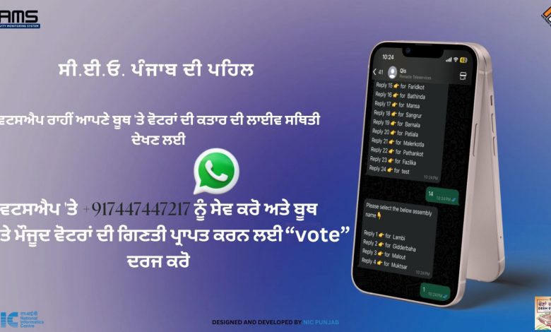 ਜਲੰਧਰ ਪੱਛਮੀ ਉਪ ਚੋਣ – ਵੋਟਰਾਂ ਦੀ ਸਹੂਲਤ ਲਈ ਵਿਸ਼ੇਸ਼ ਉਪਰਾਲਾ , ਵਟਸਐਪ ਨੰਬਰ +917447447217 ਰਾਹੀਂ ਘਰ ਬੈਠੇ ਪੋਲਿੰਗ ਬੂਥਾਂ ’ਤੇ ਲੱਗੀ ਕਤਾਰ ਬਾਰੇ ਕਰੋ ਜਾਣਕਾਰੀ ਹਾਸਲ