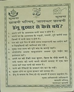 जालंधर कैंट, सैवी चावला/रमन जिंदल। कैंटोनमेंट बोर्ड जालंधर के CEO ओम पाल सिंह के दिशा निर्देशों व सेनरटी सुपरिटेंडेंट सुरजीत कुमार की अगवाई में सेनरटी इंस्पेक्टर सुनील कुमार व उनकी टीम द्वारा डेंगू से बचाव हेतु लोगों को जागरूक किया जा रहा है। इस सबंध में घर घर जाकर इश्तिहार बाटें जा रहे हैं, जिसमें डेंगू से बचाव हेतु जानकारी दी जा रही है।