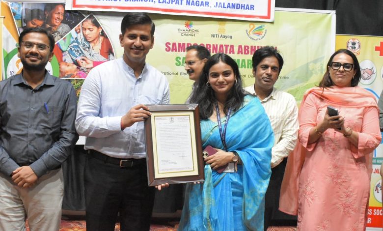 ਜਲੰਧਰ, ਐਚ ਐਸ ਚਾਵਲਾ। ਨੀਤੀ ਆਯੋਗ ਵੱਲੋਂ ਸ਼ੁਰੂ ਕੀਤੇ ਐਸਪੀਰੇਸ਼ਨਲ ਬਲਾਕਸ ਪ੍ਰੋਗਰਾਮ ਤਹਿਤ ਬਲਾਕ ਸ਼ਾਹਕੋਟ ਦਾ ਸੰਪੂਰਨਤਾ ਅਭਿਆਨ ਸਨਮਾਨ ਸਮਾਰੋਹ ਕਰਵਾਇਆ ਗਿਆ, ਜਿਸ ਵਿੱਚ ਡਿਪਟੀ ਕਮਿਸ਼ਨਰ ਡਾ. ਹਿਮਾਂਸ਼ੂ ਅਗਰਵਾਲ ਵੱਲੋਂ ਬਲਾਕ ਸ਼ਾਹਕੋਟ ਨੂੰ ਇਸ ਵੱਕਾਰੀ ਪ੍ਰੋਗਰਾਮ ਤਹਿਤ ਦੇਸ਼ (ਜ਼ੋਨ II) ’ਚ ਅੱਵਲ ਨੰਬਰ ’ਤੇ ਲਿਆਉਣ ਵਿੱਚ ਅਹਿਮ ਭੂਮਿਕਾ ਨਿਭਾਉਣ ਵਾਲੇ ਅਧਿਕਾਰੀਆਂ/ਕਰਮਚਾਰੀਆਂ ਦਾ ਸਨਮਾਨ ਕੀਤਾ ਗਿਆ।