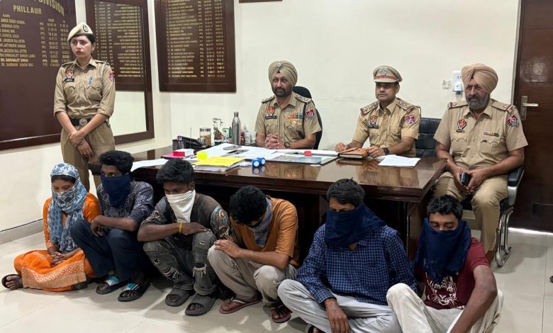 ਇਸ ਸਬੰਧੀ ਪ੍ਰੈਸ ਨੂੰ ਜਾਣਕਾਰੀ ਦਿੰਦੇ ਹੋਏ ਸ੍ਰੀ ਸਰਵਣ ਸਿੰਘ ਬਲ, ਪੀ.ਪੀ.ਐਸ. ਉਪ ਪੁਲਿਸ ਕਪਤਾਨ ਸਬ ਡਵੀਜਨ ਫਿਲੌਰ ਜੀ ਨੇ ਦੱਸਿਆ ਕਿ ਇੰਸਪੈਕਟਰ ਸੰਜੀਵ ਕਪੂਰ ਮੁੱਖ ਅਫਸਰ ਥਾਣਾ ਫਿਲੌਰ ਦੀ ਟੀਮ ਵੱਲੋਂ ਮਾੜੇ ਅਨਸਰਾਂ ਦੇ ਖਿਲਾਫ ਵਿੱਢੀ ਵਿਸ਼ੇਸ਼ ਮੁਹਿੰਮ ਤਹਿਤ ਪ੍ਰਭਾਵਸ਼ਾਲੀ ਕਾਰਵਾਈ ਅਮਲ ਵਿੱਚ ਲਿਆਉਂਦੇ ਹੋਏ ਨੈਸ਼ਨਲ ਹਾਈਵੇ ਜੀ.ਟੀ ਰੋਡ ਫਿਲੌਰ ਪਰ ਟਰੱਕ ਡਰਾਈਵਰਾਂ ਪਾਸੋਂ ਅਤੇ ਆਮ ਲੋਕਾਂ ਪਾਸੋਂ ਮਾਰੂ ਹਥਿਆਰਾਂ ਦਾ ਡਰਾਵਾ ਦੇ ਕੇ ਲੁੱਟਾਂ ਖੋਹਾਂ ਕਰਨ ਵਾਲੇ ਗਿਰੋਹ ਦੇ ਮੈਂਬਰ ਬਿਰਜੂ ਪੁੱਤਰ ਰਤਨ ਪਾਸਵਾਨ ਵਾਸੀ ਪੰਜਢੇਰਾ ਥਾਣਾ ਫਿਲੌਰ ਜਿਲ੍ਹਾ ਜਲੰਧਰ, ਨਰਿੰਦਰ ਕੁਮਾਰ ਉਰਫ ਨਿੰਦੀ ਪੁੱਤਰ ਹੁਸਨ ਲਾਲ ਵਾਸੀ ਰਵੀਦਾਸਪੁਰਾ ਮਹੱਲਾ ਥਾਣਾ ਫਿਲੌਰ ਜਿਲ੍ਹਾ ਜਲੰਧਰ, ਸਨੀ ਬਾਬਾ ਪੁੱਤਰ ਰਾਮੇਸ਼ ਕੁਮਾਰ ਵਾਸੀ ਜਗਤਪੁਰਾ ਥਾਣਾ ਫਿਲੌਰ ਜਿਲ੍ਹਾ ਜਲੰਧਰ, ਸਤਿੰਦਰ ਸਿੰਘ ਪੁੱਤਰ ਮੁਖਤਿਆਰ ਸਿੰਘ ਵਾਸੀ ਚੂਹੜ ਥਾਣਾ ਮੋਹਰਬਾਨ ਜਿਲਾ ਲੁਧਿਆਣਾ, ਕੁਲਦੀਪ ਮਹੁੰਮਦ ਪੁੱਤਰ ਸੋਮ ਮਹੁੰਮਦ ਵਾਸੀ ਮੁਠੱਡਾ ਕਲਾ ਥਾਣਾ ਫਿਲੌਰ ਜਿਲ੍ਹਾ ਜਲੰਧਰ ਅਤੇ ਅੰਜੂ ਰਾਣੀ ਪੁੱਤਰੀ ਅਸ਼ੋਕ ਕੁਮਾਰ ਵਾਸੀ ਅਕਲਪੁਰ ਰੋਡ ਫਿਲੌਰ ਥਾਣਾ ਫਿਲੌਰ ਜਿਲ੍ਹਾ ਜਲੰਧਰ ਹਾਲ ਵਾਸੀ ਖਾਨਪੁਰ ਥਾਣਾ ਫਿਲੌਰ ਜਿਲ੍ਹਾ ਜਲੰਧਰ ਕਾਬੂ ਕਰਕੇ ਇਹਨਾਂ ਪਾਸੋਂ ਖੋਹ ਕੀਤੇ 04 ਮੋਬਾਇਲ ਫੋਨ. 01 ਐਕਟੀਵਾ, 02 ਦਾਤਰ ਲੋਹਾ, 18 ਗ੍ਰਾਮ ਹੈਰੋਇਨ, 1 ਕਿਲੋ 24 ਗ੍ਰਾਮ ਗਾਂਜਾ ਬਰਾਮਦ ਕਰਕੇ ਮੁਕੱਦਮਾ ਨੰਬਰ 132 ਮਿਤੀ 07.05.2025 ਅ/ਧ 310(4), 310(5), 111-BNS, 20/21/29-61-85 NDPS ACT ਥਾਣਾ ਫਿਲੌਰ ਦਰਜ ਕੀਤਾ ਗਿਆ। ਜੋ ਮੁੱਢਲੀ ਪੁੱਛਗਿੱਛ ਦੌਰਾਨ ਇਹ ਗੱਲ ਸਾਹਮਣੇ ਆਈ ਹੈ ਕਿ ਇਹ ਗਿਰੋਹ ਪਿਛਲੇ ਕਾਫੀ ਸਮੇਂ ਤੋਂ ਨੈਸ਼ਨਲ ਹਾਈਵੇ ਪਰ ਲੁੱਟ ਖੋਹ ਦੀਆਂ ਵਾਰਦਾਤਾਂ ਨੂੰ ਅੰਜਮ ਦਿੰਦੇ ਸਨ। ਇਹਨਾਂ ਦਾ ਪੁਲਿਸ ਰਿਮਾਂਡ ਹਾਸਲ ਕਰਕੇ ਹੋਰ ਪੁੱਛਗਿੱਛ ਕੀਤੀ ਜਾ ਰਹੀ ਹੈ।