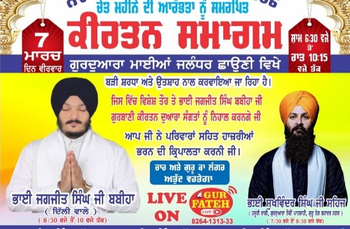ਜਲੰਧਰ ਕੈਂਟ, ਐਚ ਐਸ ਚਾਵਲਾ। ਨਵਾਂ ਸਾਲ ਨਾਨਕਸ਼ਾਹੀ ਸੰਮਤ 556 ਚੇਤ ਮਹੀਨੇ ਦੀ ਆਰੰਭਤਾ ਨੂੰ ਸਮਰਪਿਤ ਕੀਰਤਨ ਸਮਾਗਮ 7 ਮਾਰਚ ਦਿਨ ਵੀਰਵਾਰ ਨੂੰ ਧਾਰਮਿਕ ਸੁਸਾਇਟੀਆਂ ਅਤੇ ਸਮੂਹ ਸਾਧ ਸੰਗਤ ਦੇ ਸਹਿਯੋਗ ਨਾਲ ਗੁਰਦੁਆਰਾ ਮਾਈਆਂ ਜਲੰਧਰ ਛਾਉਣੀ ਵਿਖੇ ਸ਼ਾਮ 6.30 ਵੱਜੇ ਤੋਂ ਰਾਤ 10.15 ਵੱਜੇ ਤੱਕ ਬੜੀ ਸ਼ਰਧਾ ਅਤੇ ਉਤਸ਼ਾਹ ਨਾਲ ਕਰਵਾਏ ਜਾ ਰਹੇ ਹਨ।