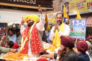 ਜਲੰਧਰ, (PRIME INDIAN NEWS) :- ਲੋਕ ਸਭਾ ਹਲਕਾ ਜਲੰਧਰ ਤੋਂ ਚੋਣ ਲੜ ਰਹੇ ਆਮ ਆਦਮੀ ਪਾਰਟੀ ਦੇ ਉਮੀਦਵਾਰ ਪਵਨ ਕੁਮਾਰ ਟੀਨੂੰ ਦੇ ਹੱਕ ਵਿੱਚ ਮੁੱਖ ਮੰਤਰੀ ਭਗਵੰਤ ਸਿੰਘ ਮਾਨ ਵੱਲੋਂ ਅੱਜ ਸ਼ਾਮ ਕਰਤਾਰਪੁਰ ਵਿੱਚ ਰੋਡ ਸ਼ੋਅ ਕੀਤਾ ਗਿਆ। ਇਸ ਰੋਡ ਸ਼ੋਅ ਦੌਰਾਨ ਫੁੱਲਾਂ ਨਾਲ ਲੱਦੀ ਗੱਡੀ ਵਿੱਚ ਭਗਵੰਤ ਸਿੰਘ ਮਾਨ ਦੇ ਨਾਲ ਪਵਨ ਟੀਨੂੰ ਅਤੇ ਕੈਬਨਿਟ ਮੰਤਰੀ ਬਲਕਾਰ ਸਿੰਘ ਵੀ ਸਵਾਰ ਸਨ।