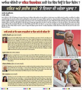 ਕਿਹਾ – ਭਾਜਪਾ ਦੇਸ਼ ਵਿੱਚੋ ਦਲਿਤ ਰਿਜ਼ਰਵੇਸ਼ਨ ਨੂੰ ਖ਼ਤਮ ਕਰਕੇ ਦਲਿਤ ਵਰਗ ਦੇ ਲੋਕਾਂ ਉਪਰ ਕਰਨਾ ਚਾਹੁੰਦੀ ਹੈ ਹਕੂਮਤ