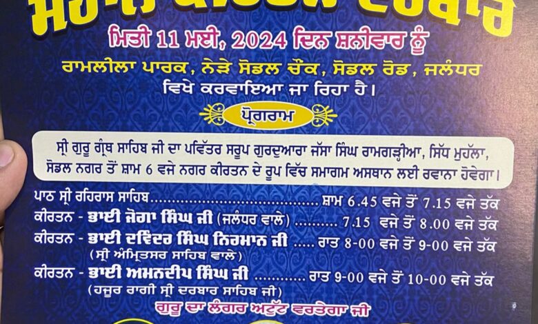 ਜਲੰਧਰ, ਐਚ ਐਸ ਚਾਵਲਾ। ਲੋਕ ਭਲਾਈ ਵੈਲਫੇਅਰ ਸੋਸਾਇਟੀ (ਰਜਿ) ਸੋਡਲ ਨਗਰ ਜਲੰਧਰ ਵੱਲੋਂ ਇਲਾਕੇ ਦੀ ਚੜ੍ਹਦੀ ਕਲਾ ਲਈ ਇੱਕ ਮਹਾਨ ਕੀਰਤਨ ਦਰਬਾਰ ਮਿਤੀ 11 ਮਈ ਦਿਨ ਸ਼ਨੀਵਾਰ ਰਾਮਲੀਲਾ ਪਾਰਕ, ਨੇੜੇ ਸੋਡਲ ਚੌਂਕ, ਜਲੰਧਰ ਵਿਖੇ ਕਰਵਾਇਆ ਜਾ ਰਿਹਾ ਹੈ। ਇਹ ਜਾਣਕਾਰੀ ਸਾਂਝੀ ਕਰਦੇ ਸੋਸਾਇਟੀ ਦੇ ਮੈਂਬਰਾਂ ਬੰਟੀ ਅਰੋੜਾ, ਜਸਵੰਤ ਸਿੰਘ, ਸੋਮਨਾਥ ਸ਼ਰਮਾ, ਬਾਬੂ ਰਾਮ ਨੇ ਦੱਸਿਆ ਕਿ ਸਭ ਤੋਂ ਪਹਿਲਾਂ ਧੰਨ ਧੰਨ ਸਾਹਿਬ ਸ੍ਰੀ ਗੁਰੂ ਗ੍ਰੰਥ ਸਾਹਿਬ ਜੀ ਦੇ ਪਵਿੱਤਰ ਸਰੂਪ ਗੁਰਦੁਆਰਾ ਜੱਸਾ ਸਿੰਘ ਰਾਮਗੜੀਆ, ਸਿੱਧ ਮੁਹੱਲਾ, ਸੋਡਲ ਨਗਰ ਤੋਂ ਸ਼ਾਮ 6 ਵਜੇ ਨਗਰ ਕੀਰਤਨ ਦੇ ਰੂਪ ਵਿੱਚ ਰਾਮਲੀਲਾ ਪਾਰਕ ਨੇੜੇ ਸੋਡਲ ਚੌਂਕ ਵਿਖੇ ਲਿਆਂਦੇ ਜਾਣਗੇ।