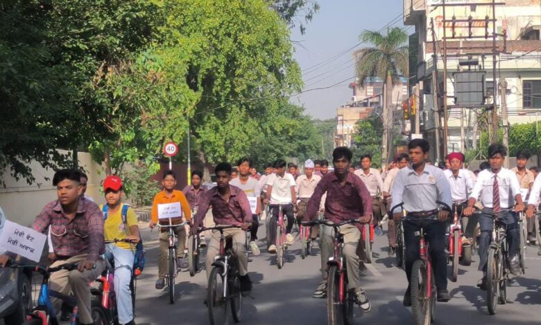 ਜਲੰਧਰ, ਐਚ ਐਸ ਚਾਵਲਾ। ਲੋਕ ਸਭਾ ਚੋਣਾਂ-2024 ਦੌਰਾਨ ਵੱਧ ਤੋਂ ਵੱਧ ਵੋਟਰਾਂ ਦੀ ਸ਼ਮੂਲੀਅਤ ਨੂੰ ਯਕੀਨੀ ਬਣਾਉਣ ਲਈ ਜ਼ਿਲ੍ਹਾ ਪ੍ਰਸ਼ਾਸਨ ਵੱਲੋਂ ਕਰਵਾਈਆਂ ਜਾ ਰਹੀਆਂ ਜਾਗਰੂਕਤਾ ਗਤੀਵਿਧੀਆਂ ਤਹਿਤ ਅੱਜ ਸਥਾਨਕ ਸਕੂਲ ਆਫ ਐਮੀਨੈਂਸ ਲਾਡੋਵਾਲੀ ਰੋਡ ਦੇ ਵਿਦਿਆਰਥੀਆਂ ਵੱਲੋਂ ਵੋਟਰ ਜਾਗਰੂਕਤਾ ਸਾਈਕਲ ਰੈਲੀ ਕੱਢੀ ਗਈ। ਸਿਸਟੇਮੈਟਿਕ ਵੋਟਰਜ਼ ਐਜੂਕੇਸ਼ਨ ਐਂਡ ਇਲੈਕਟੋਰਲ ਪਾਰਟੀਸਿਪੇਸ਼ਨ (ਸਵੀਪ) ਪ੍ਰੋਗਰਾਮ ਤਹਿਤ ਕੱਢੀ ਗਈ ਇਸ ਰੈਲੀ ਨੂੰ ਐਸ.ਡੀ.ਐਮ. ਜਲੰਧਰ-2 ਬਲਬੀਰ ਰਾਜ ਸਿੰਘ ਵੱਲੋਂ ਹਰੀ ਝੰਡੀ ਦਿਖਾ ਕੇ ਰਵਾਨਾ ਕੀਤਾ ਗਿਆ।