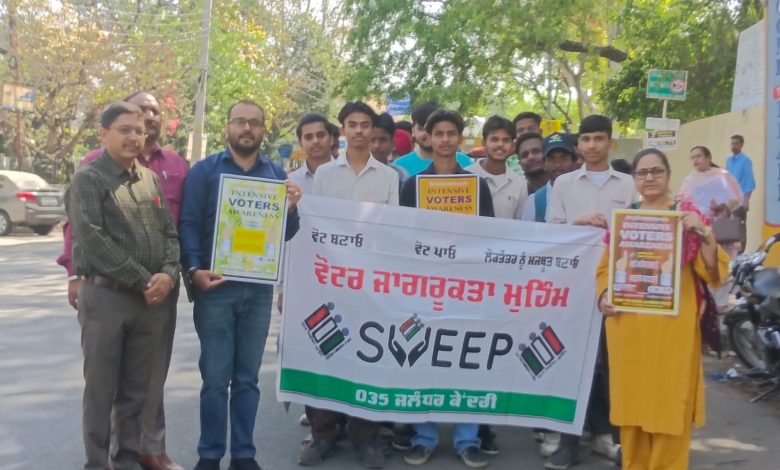 ਜਲੰਧਰ, ਐਚ ਐਸ ਚਾਵਲਾ। ਲੋਕ ਸਭਾ ਚੋਣਾਂ-2024 ਦੌਰਾਨ ਵੱਧ ਤੋਂ ਵੱਧ ਲੋਕਾਂ ਨੂੰ ਆਪਣੇ ਵੋਟ ਦੇ ਅਧਿਕਾਰ ਦੀ ਵਰਤੋਂ ਲਈ ਜਾਗਰੂਕ ਕਰਨ ਦੇ ਮੰਤਵ ਨਾਲ ਜ਼ਿਲ੍ਹਾ ਚੋਣ ਅਫ਼ਸਰ ਡਾ. ਹਿਮਾਂਸ਼ੂ ਅਗਰਵਾਲ ਦੇ ਦਿਸ਼ਾ-ਨਿਰਦੇਸ਼ਾਂ ’ਤੇ ਜ਼ਿਲ੍ਹੇ ਭਰ ਵਿੱਚ ਵੋਟਰ ਜਾਗਰੂਕਤਾ ਗਤੀਵਿਧੀਆਂ ਕਰਵਾਈਆਂ ਜਾ ਰਹੀਆਂ ਹਨ।