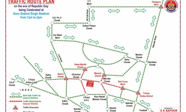 ਗਣਤੰਤਰ ਦਿਵਸ ਦੇ ਜਸ਼ਨਾਂ ਦੌਰਾਨ ਸੁਚਾਰੂ ਆਵਾਜਾਈ ਨੂੰ ਯਕੀਨੀ ਬਣਾਉਣ ਲਈ, ਸ਼ਹਿਰ ਵਿੱਚ ਕਈ ਟ੍ਰੈਫਿਕ ਰੂਟ ਡਾਇਵਰਸ਼ਨ ਕੀਤੇ ਗਏ ਹਨ ਲਾਗੂ