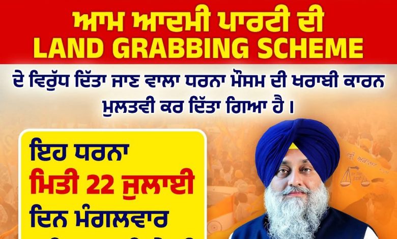 ਸ਼੍ਰੋਮਣੀ ਅਕਾਲੀ ਦਲ ਦੇ ਸੀਨੀਅਰ ਮੀਤ ਪ੍ਰਧਾਨ ਅਤੇ ਸਕੱਤਰ ਡਾ. ਦਲਜੀਤ ਸਿੰਘ ਚੀਮਾ ਨੇ ਪਾਰਟੀ ਮੁੱਖ ਦਫ਼ਤਰ ਤੋਂ ਇੱਕ ਜ਼ਰੂਰੀ ਸੂਚਨਾ ਦਿੰਦੇ ਹੋਏ ਕਿਹਾ ਹੈ ਕਿ ਸ਼੍ਰੋਮਣੀ ਅਕਾਲੀ ਦਲ ਦੇ ਸਮੂਹ ਆਗੂਆਂ ਅਤੇ ਵਰਕਰਾਂ ਦੇ ਧਿਆਨ ਵਿੱਚ ਲਿਆਇਆ ਜਾਂਦਾ ਹੈ ਕਿ ਕੱਲ ਮਿਤੀ 15 ਜੁਲਾਈ ਨੂੰ ਲੁਧਿਆਣਾ ਵਿਖੇ ਸ਼੍ਰੋਮਣੀ ਅਕਾਲੀ ਦਲ ਵੱਲੋਂ ਪਾਰਟੀ ਪ੍ਰਧਾਨ ਸ ਸੁਖਬੀਰ ਸਿੰਘ ਬਾਦਲ ਜੀ ਦੀ ਅਗਵਾਈ ਹੇਠ ਦਿੱਤਾ ਜਾਣ ਵਾਲਾ ਧਰਨਾ ਮੌਸਮ ਦੀ ਖਰਾਬੀ ਕਾਰਨ ਮੁਲਤਵੀ ਕਰ ਦਿੱਤਾ ਗਿਆ ਹੈ ਅਤੇ ਹੁਣ ਇਹ ਧਰਨਾ ਮਿਤੀ 22 ਜੁਲਾਈ 2025 ਦਿਨ ਮੰਗਲਵਾਰ ਲੁਧਿਆਣਾ ਵਿਖੇ ਹੀ ਦਿੱਤਾ ਜਾਵੇਗਾ। ਕਿਰਪਾ ਕਰਕੇ ਸਾਰੇ ਆਗੂ ਸਹਿਬਾਨ ਨੋਟ ਕਰਨ ਜੀ।