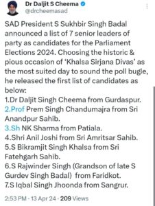 1. ਗੁਰਦਾਸਪੁਰ ਤੋਂ ਡਾਕਟਰ ਦਲਜੀਤ ਸਿੰਘ ਚੀਮਾ