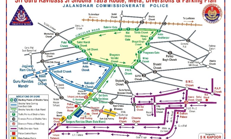 ਜਲੰਧਰ, ਐਚ ਐਸ ਚਾਵਲਾ। ਸ੍ਰੀ ਗੁਰੂ ਰਵਿਦਾਸ ਮਹਾਰਾਜ ਜੀ ਦੇ ਪ੍ਰਕਾਸ਼ ਦਿਵਸ ਦੇ ਸਬੰਧ ਵਿੱਚ ਸਲਾਨਾ ਜੋੜ ਮੇਲਾ ਮਿਤੀ 31/01/2026 ਤੋਂ ਮਿਤੀ 02/02/2026 ਤੱਕ ਸਤਿਗੁਰੂ ਰਵਿਦਾਸ ਧਾਮ ਬੂਟਾਮੰਡੀ, ਨਕੋਦਰ ਰੋਡ ਜਲੰਧਰ ਵਿੱਖੇ ਮਨਾਇਆ ਜਾ ਰਿਹਾ ਹੈ। ਇਸ ਤੋਂ ਇਲਾਵਾ ਮਿਤੀ 31/01/2026 ਨੂੰ ਜਲੰਧਰ ਸ਼ਹਿਰ ਅੰਦਰ ਵਿਸ਼ਾਲ ਸ਼ੋਭਾ ਯਾਤਰਾ ਸਤਿਗੁਰੂ ਰਵਿਦਾਸ ਧਾਮ ਬੂਟਾਮੰਡੀ ਤੋਂ ਸ਼ੁਰੂ ਹੋ ਕੇ ਵਾਇਆ ਗੁਰੂ ਰਵਿਦਾਸ ਚੋਂਕ-ਨਕੋਦਰ ਚੋਂਕ-ਜੋਤੀ ਚੌਂਕ-ਪੀ.ਐਨ.ਬੀ.ਚੋਂਕ-ਮਿਲਾਪ ਚੋਂਕ-ਸ਼ਹੀਦ ਭਗਤ ਸਿੰਘ ਚੋਂਕ-ਅੱਡਾ ਹੁਸ਼ਿਆਰਪੁਰ-ਮਾਈ ਹੀਰਾ ਗੇਟ-ਪਟੇਲ ਚੋਂਕ-ਸਬਜੀ ਮੰਡੀ ਚੌਂਕ-ਬਸਤੀ ਅੱਡਾ ਚੋਂਕ-ਜੋਤੀ ਚੋਂਕ-ਨਕੋਦਰ ਚੋਂਕ-ਗੁਰੂ ਰਵਿਦਾਸ ਚੋਂਕ ਰਾਂਹੀ ਹੁੰਦੀ ਹੋਈ ਸਤਿਗੁਰੂ ਰਵਿਦਾਸ ਧਾਮ ਬੂਟਾਮੰਡੀ ਜਲੰਧਰ ਵਿਖੇ ਸਮਾਪਤ ਹੋਵੇਗੀ। ਇਸ ਸਲਾਨਾ ਜੋੜ ਮੇਲੇ ਅਤੇ ਸ਼ੋਭਾ-ਯਾਤਰਾ ਵਿੱਚ ਭਾਰੀ ਗਿਣਤੀ ਵਿੱਚ ਸ਼ਰਧਾਲੂਆਂ/ਸੰਗਤਾਂ ਅਤੇ ਵੀ.ਆਈ.ਪੀਜ਼ ਦੇ ਸ਼ਾਮਲ ਹੋਣ ਦਾ ਅਨੁਮਾਨ ਹੈ। ਜਿਸ ਨੂੰ ਧਿਆਨ ਵਿੱਚ ਰੱਖਦੇ ਹੋਏ ਕਮਿਸ਼ਨਰੇਟ ਜਲੰਧਰ ਵਲੋਂ ਆਮ ਪਬਲਿਕ ਦੀ ਸਹੂਲਤ ਲਈ ਟਰੈਫਿਕ ਡਾਇਵਰਸ਼ਨਾਂ ਅਤੇ ਵਾਹਨਾਂ ਦੀ ਪਾਰਕਿੰਗ ਲਈ ਸਥਾਨ ਨਿਰਧਾਰਿਤ ਕੀਤੇ ਗਏ ਹਨ ਤਾਂ ਜੋ ਇਸ ਦੌਰਾਨ ਆਵਾਜਾਈ ਨੂੰ ਨਿਰਵਿਘਨ ਅਤੇ ਸੁਚਾਰੂ ਤਰੀਕੇ ਨਾਲ ਬਹਾਲ ਰੱਖਿਆ ਜਾ ਸਕੇ:-