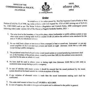 ਮਾਣਯੋਗ ਸੁਪਰੀਮ ਕੋਰਟ ਦੇ ਹੁਕਮਾਂ ਦੇ ਹਵਾਲੇ ਨਾਲ ਪੁਲਿਸ ਕਮਿਸ਼ਨਰ ਵਲੋਂ ਜਾਰੀ ਹੁਕਮਾਂ ਤਹਿਤ ਜਨਤਕ ਥਾਵਾਂ ਦੀ ਸੀਮਾ ’ਤੇ ਜਿਥੇ ਲਾਊਡ ਸਪੀਕਰ ਜਾਂ ਪਬਲਿਕ ਐਡਰੈੱਸ ਸਿਸਟਮ ਜਾਂ ਕੋਈ ਵੀ ਆਵਾਜ਼ ਪੈਦਾ ਕਰਨ ਵਾਲਾ ਸਰੋਤ ਵਰਤਿਆ ਜਾ ਰਿਹਾ ਹੈ, ਦੀ ਆਵਾਜ਼ ਖੇਤਰ ਲਈ ਨਿਸ਼ਚਿਤ ਆਵਾਜ਼ ਮੁਤਾਬਕ ਰੱਖਣ ਦੇ ਆਦੇਸ਼ ਦਿੱਤੇ ਗਏ ਹਨ। ਹੁਕਮਾਂ ਅਨੁਸਾਰ ਕੋਈ ਵੀ ਵਿਅਕਤੀ ਰਾਤ 10 ਵਜੇ ਤੋਂ ਸਵੇਰੇ 6 ਵਜੇ ਦੇ ਦਰਮਿਆਨ (ਸਿਵਾਏ ਪਬਲਿਕ ਐਮਰਜੈਂਸੀ ਦੇ) ਮੈਰਿਜ ਪੈਲੇਸਾਂ ਤੇ ਹੋਟਲਾਂ ਵਿੱਚ ਢੋਲ ਜਾਂ ਭੋਂਪੂ , ਆਵਾਜ਼ ਪੈਦਾ ਕਰਨ ਵਾਲਾ ਕੋਈ ਯੰਤਰ, ਸਾਊਂਡ ਐਂਪਲੀਫਾਇਰ ਅਤੇ ਡੀ.ਜੇਜ਼ ਆਦਿ ਨਹੀਂ ਵਜਾਏਗਾ। ਇਸੇ ਤਰ੍ਹਾਂ ਪ੍ਰਾਈਵੇਟ ਮਾਲਕੀ ਵਾਲੇ ਸਾਊਂਡ ਸਿਸਟਮ ਜਾਂ ਆਵਾਜ਼ ਪੈਦਾ ਕਰਨ ਵਾਲੇ ਯੰਤਰ ਦਾ ਸ਼ੋਰ ਦਾ ਪੱਧਰ ਪ੍ਰਾਈਵੇਟ ਥਾਂ ਦੇ ਹੱਦ ਖੇਤਰ ਲਈ ਤੈਅ ਸ਼ੋਰ ਮਾਪਦੰਡਾਂ 5 ਡੀ.ਬੀ.(ਏ) ਤੋਂ ਵੱਧ ਨਹੀਂ ਹੋਵੇਗਾ। ਹੁਕਮਾਂ ਵਿੱਚ ਇਹ ਵੀ ਕਿਹਾ ਗਿਆ ਹੈ ਕਿ ਮਿਊਜ਼ਿਕ ਸਿਸਟਮ ਵਾਲੇ ਵਾਹਨਾਂ ਦੇ ਮਾਮਲੇ ਵਿੱਚ ਇਹ ਯਕੀਨੀ ਬਣਾਇਆ ਜਾਣਾ ਚਾਹੀਦਾ ਹੈ ਕਿ ਮਿਊਜ਼ਿਕ ਸਿਸਟਮ ਰਾਹੀਂ ਪੈਦਾ ਹੋਣ ਵਾਲੀ ਆਵਾਜ਼ ਦਿਨ ਦੇ ਕਿਸੇ ਵੀ ਸਮੇਂ ਵਾਹਨ ਤੋਂ ਬਾਹਰ ਨਾ ਸੁਣਾਈ ਦੇਵੇ।