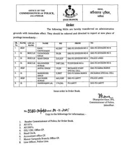 ਜਲੰਧਰ, ਐਚ ਐਸ ਚਾਵਲਾ। ਪੁਲਿਸ ਕਮਿਸ਼ਨਰ ਜਲੰਧਰ ਸ਼੍ਰੀਮਤੀ ਧਨਪ੍ਰੀਤ ਕੌਰ IPS ਵਲੋਂ ਕਈ ਪੁਲਿਸ ਸਟੇਸ਼ਨਾਂ ਦੇ SHO,s ਦਾ ਤਬਾਦਲਾ ਕਰ ਦਿੱਤਾ ਗਿਆ ਹੈ, ਜਦਕਿ 2 ਹੋਰਾਂ ਨੂੰ ਲਾਈਨ ਹਾਜ਼ਿਰ ਕੀਤਾ ਗਿਆ ਹੈ। SHO ਡਿਵੀਜ਼ਨ ਨੰ.6 ਇੰਸਪੈਕਟਰ ਅਜਾਇਬ ਸਿੰਘ ਅਤੇ SHO ਜਲੰਧਰ ਕੈਂਟ ਇੰਸਪੈਕਟਰ ਰਵਿੰਦਰ ਕੁਮਾਰ ਨੂੰ ਪੁਲਿਸ ਲਾਈਨ ਭੇਜ ਦਿੱਤਾ ਗਿਆ ਹੈ। ਪੜ੍ਹੋ ਪੂਰੀ ਸੂਚੀ 👇
