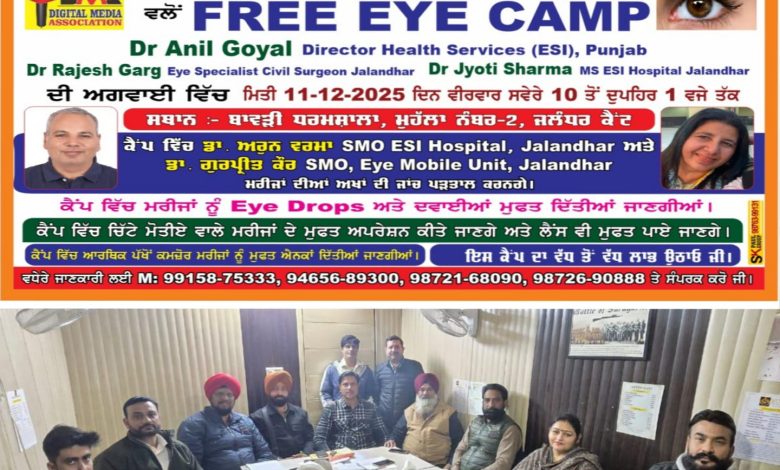ਜਲੰਧਰ, (ਸੈਵੀ ਚਾਵਲਾ/ਰਮਨ ਜਿੰਦਲ) :- ਸਮੁੱਚੀ ਮਨੁੱਖਤਾ ਦੀ ਸੇਵਾ ਦੇ ਉਦੇਸ਼ ਨੂੰ ਮੁੱਖ ਰੱਖਦੇ ਹੋਏ DIGITAL MEDIA ASSOCIATION (REGD.) DMA ਵਲੋਂ ਡਾ. ਅਨਿਲ ਗੋਇਲ Director Health Services (ESI), Punjab, ਡਾ. ਰਾਜੇਸ਼ ਗਰਗ Eye Specialist, Civil Surgeon Jalandhar ਅਤੇ ਡਾ. ਜੋਤੀ ਸ਼ਰਮਾ MS, ESI Hospital ਦੀ ਅਗਵਾਈ ਵਿੱਚ “ਅੱਖਾਂ ਦਾ ਮੁਫ਼ਤ ਮੈਡੀਕਲ ਕੈਂਪ” ਮਿਤੀ 11.12.2025 ਦਿਨ ਵੀਰਵਾਰ ਨੂੰ ਬਾਵੜੀ ਧਰਮਸ਼ਾਲਾ, ਮੁਹੱਲਾ ਨੰਬਰ-2 ਜਲੰਧਰ ਕੈਂਟ ਵਿਖੇ ਸਵੇਰੇ 10 ਵਜੇ ਲੈ ਕੇ ਦੁਪਹਿਰ 1 ਵਜੇ ਤੱਕ ਲਗਾਇਆ ਜਾ ਰਿਹਾ ਹੈ।